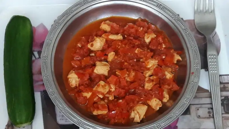 Domatesleri biraz kavuruyoruz sonra biber ve tavukları içine koyuyoruz baharat ve sarımsagı ekliyoruz 20 25 dakka pişiyor arada su ekleyin