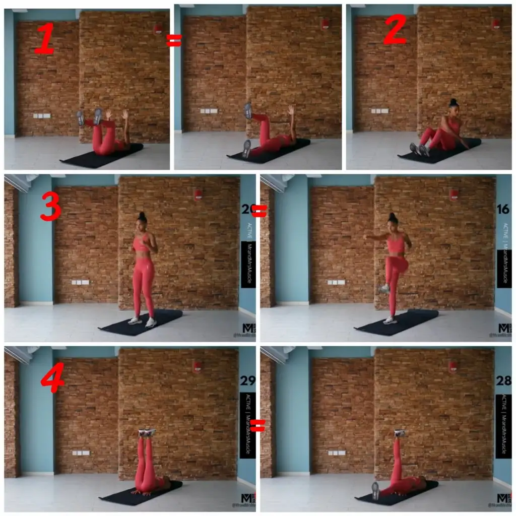 1. Harekette ayakları Tek tek indiriyoruz 2. Hareket twist 3. Harekette ayakta Tek diz kaldırıp Tek el yumruk atılıyor 4. Hareket bacakları indiriyoruz