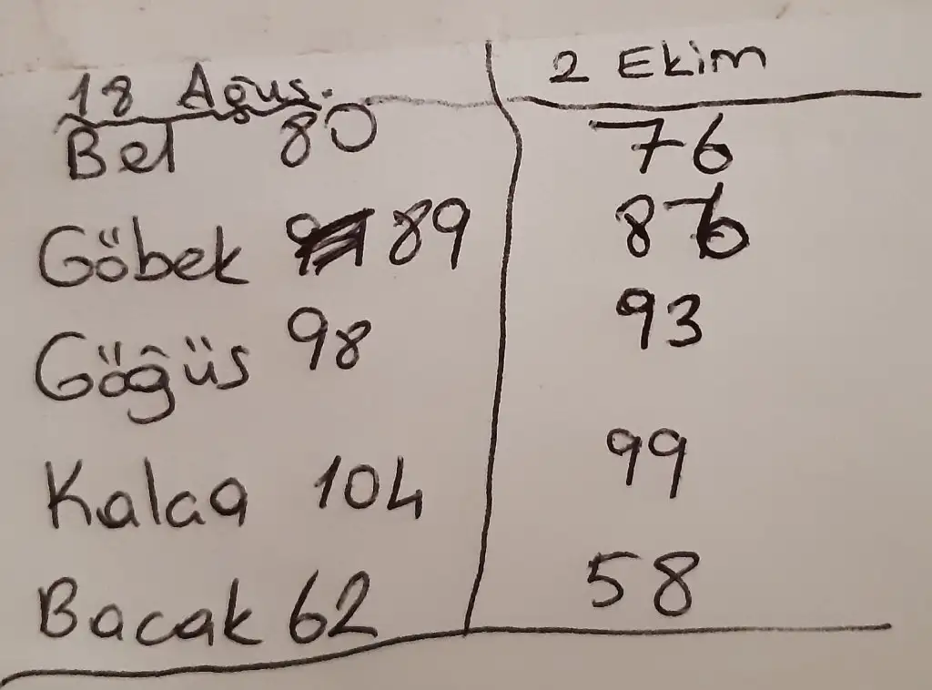 18.09.2020 56,2 kg Göğüs:85 Kollar: 25 Bel: 67 Alt Karın: 90 Basen: 96 Bacak: 53 Boyun: 30 yağ oranı: %27
