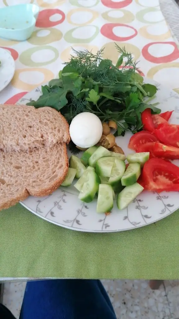 1 haşlanmış yumurta, 50 gr kadar beyaz peynir, 5 zeytin, 5 dal maydonoz, 1 domates, 1 dilim çavdar ekmeği, 1 çay kaşığı bal ve tereyağ, 2 şekersiz çay