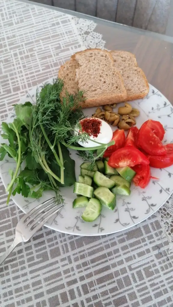 Sabah: otlu omlet, 5 zeytin, 1 kk köy peyniri, domates, salatalık, 2 dilim kızarmış ekmek