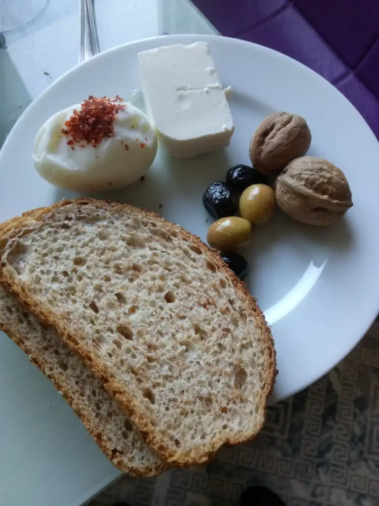 Sabah 1 küçük pankek 1 dilim yumurtalı ekmek 5 dal roka 4 zeytin 1 dilim peynir 1 bardak çay.