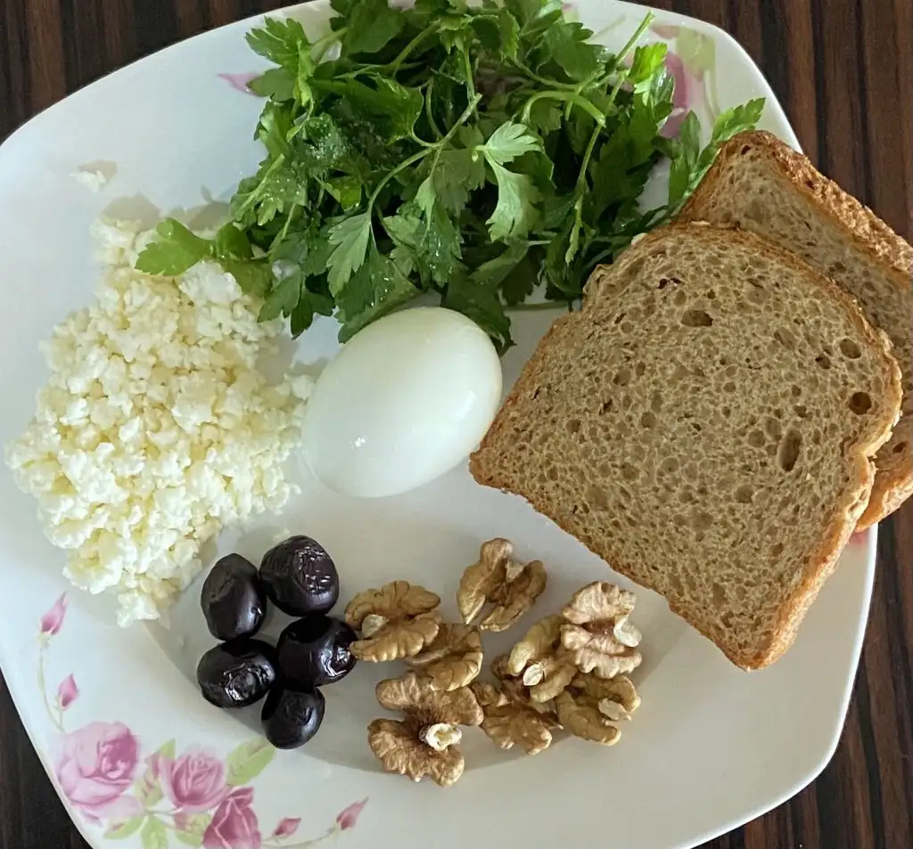 Sabah kahvaltı =2 zeytin bol yeşşilik 3 kibrit çörek otlu peynir bir Dometez +biber salçalı yumurta bir bardak çay