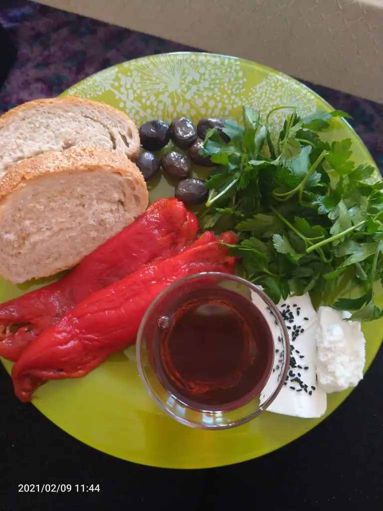 Sabah kahvaltı =2 zeytin bol yeşşilik 3 kibrit çörek otlu peynir bir Dometez +biber salçalı yumurta bir bardak çay