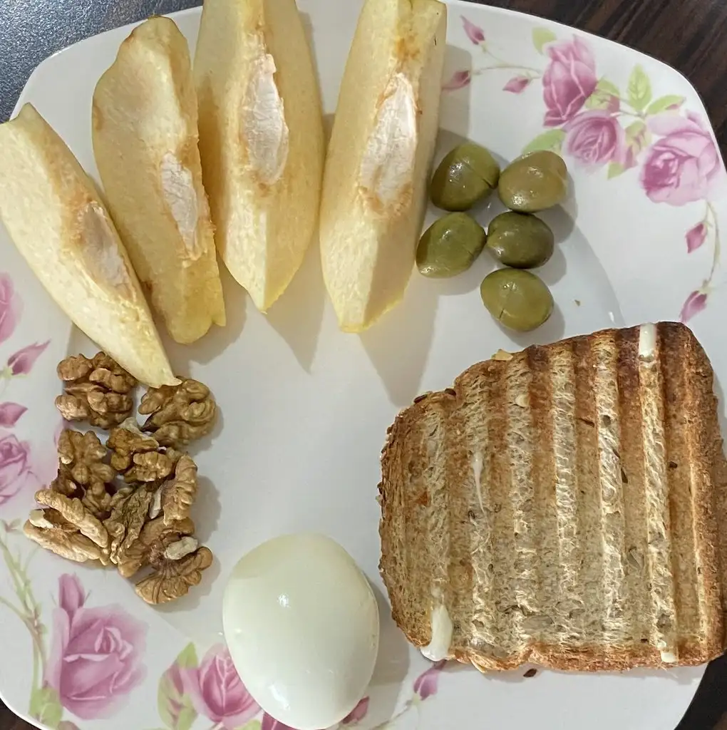 Çok iyi gitmişsin bugün canımKahvaltı(11.45) : bir haşlanmış yumurta, yedi siyah zeytin,iki dilim kızartılmış ekmek,bir tatlı kaşığı tereyağı,bir yemek kaşığı pekmez,üç dilim kaşar peyniri