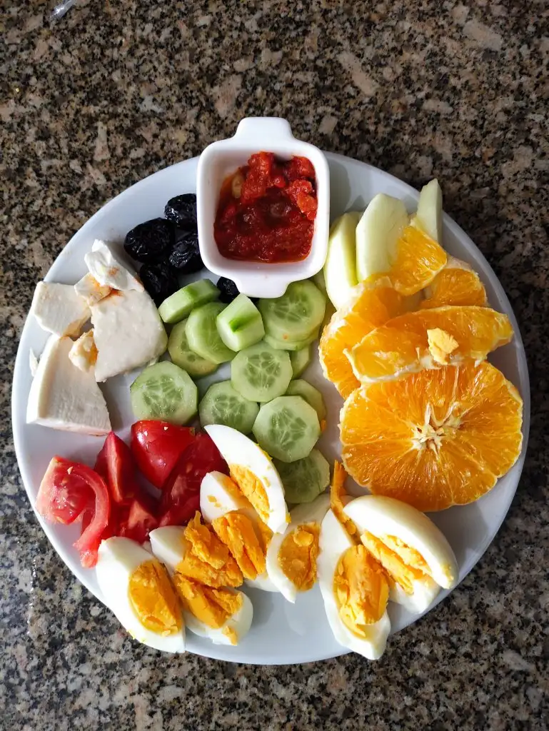 Akşam(19.30): 1 wasa 1 haşlanmış yumurta 2 domates taze soğan 5 zeytin 1 dilim beyaz peynir beyaz çay
