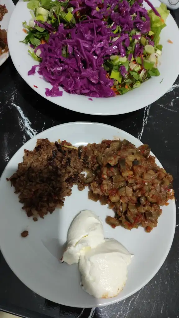 Akşam; 70 gr kıyma kavurma+ 9 yk patlıcan yemeği+2 yk yoğurt+salata