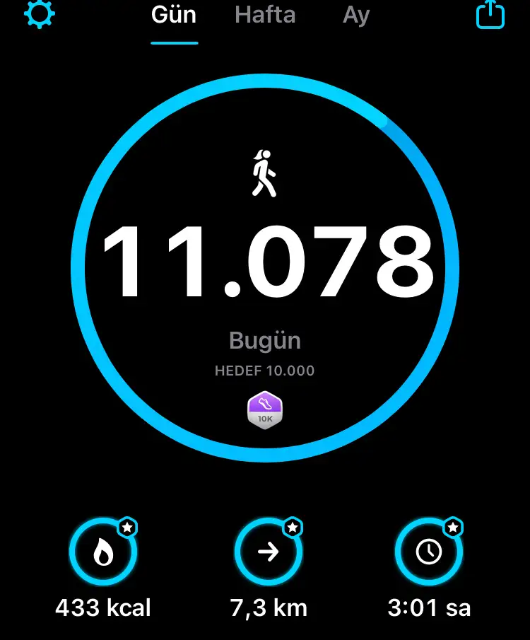 5000 adım atıldı. 15 dakika egzersiz yapıldı