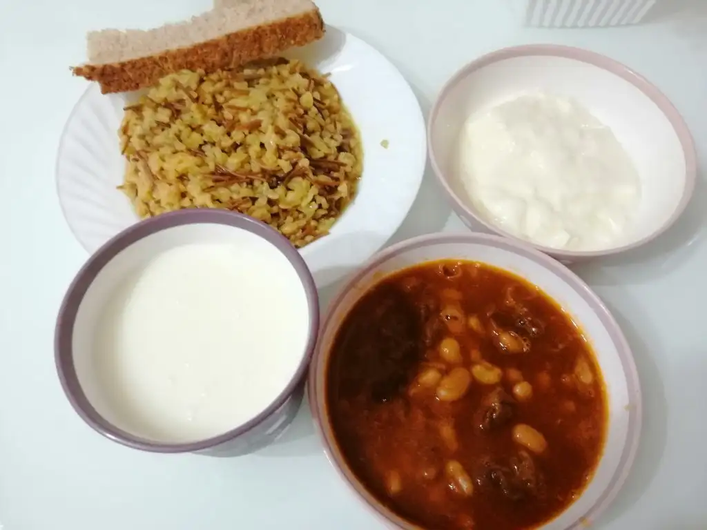 Akşam(18.00)=1 tbk bulgur pilav +1 kepçe sulu fasulye y. Kırmızı etli +1 kase yoğurt +1 bardak ayran. Yarım ekmek