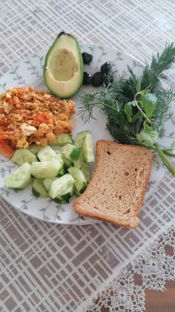 2 yumurtadan omlet, yarım avokado, yarım dilim gf (glutensiz) ekmek, yarım mandalina, yeşillik, havuç, salatalık vs.