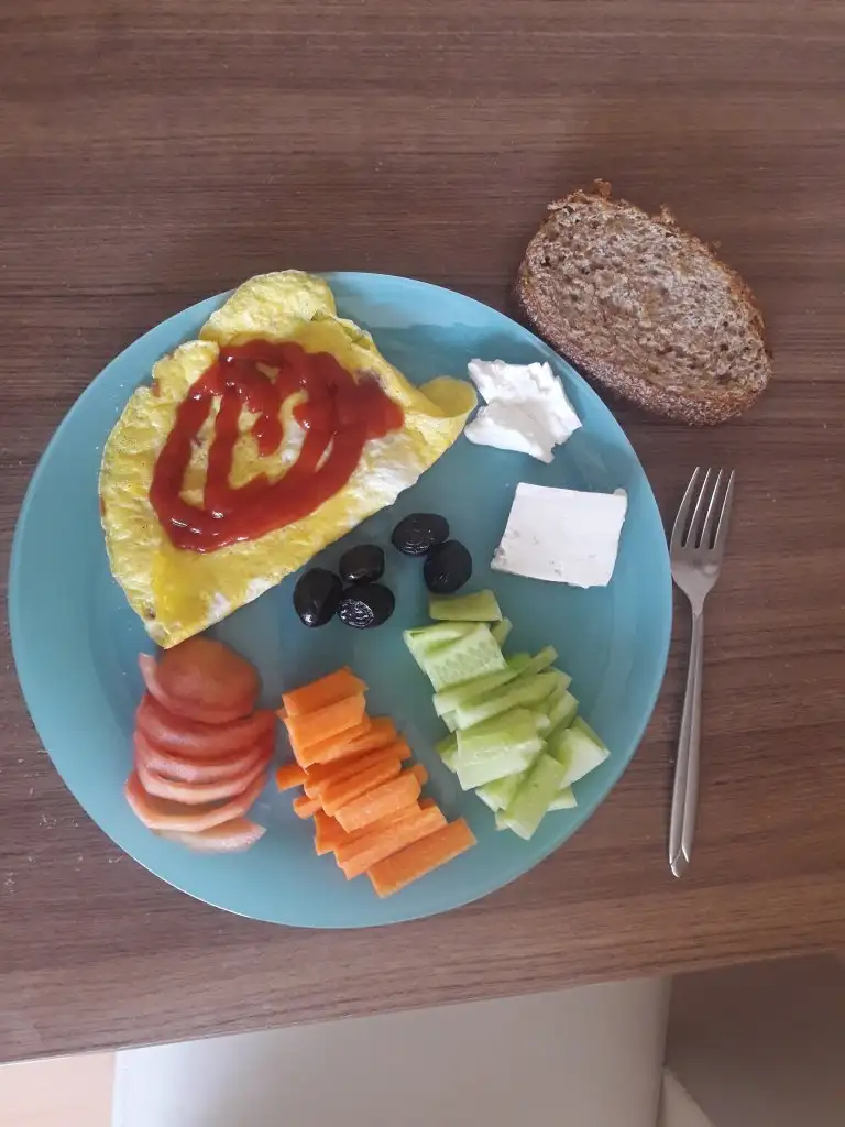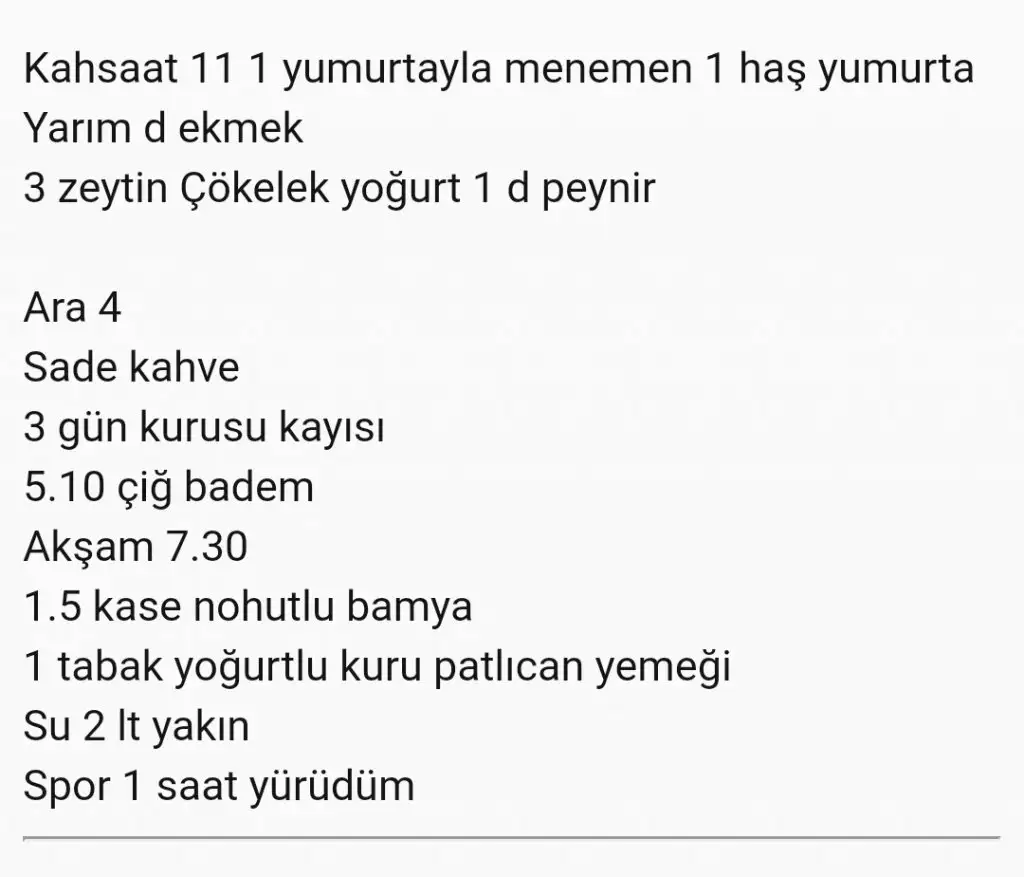 Kahvaltı(10.00)iki haşlanmış yumurta,bir dilim ekmek, 5 siyah zeytin,üç dilim beyaz peynir, yarım domates ,yarım salatalık ,