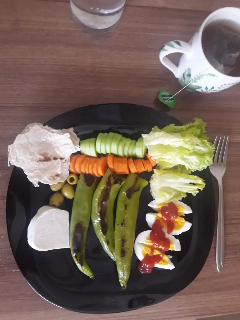 2 yumırtadan omlet, salatalık, havuç, 10 yeşil zeytin, 1 dilim ananas, 1 hurma, yeşillik