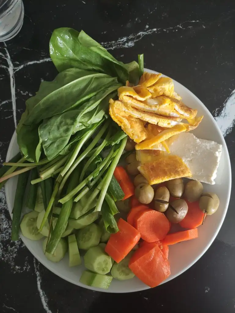 Sabah: 1 haşlama yumurta, 5 zeytin, 1 dilim peynir, domates salatalık