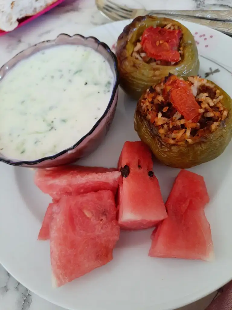 1 tabak semizotu yemegi, 2 tane haslanmis tavuk baget, 1 dilim tb ekmegi, 1 bardak ayran