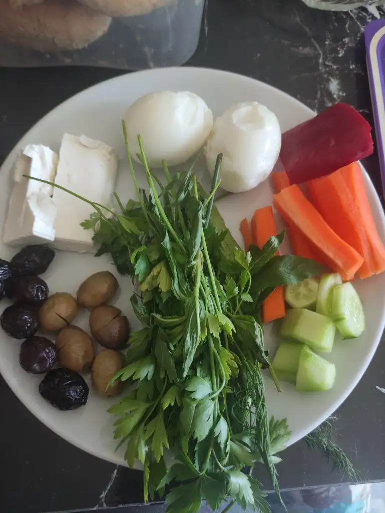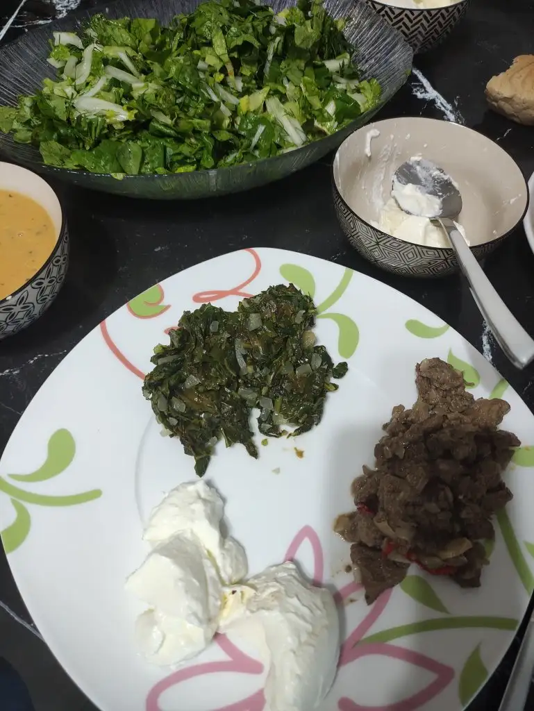 1 tabak bamya yemegi, yarim tabak tam bugday makarna, 1 kase cacik