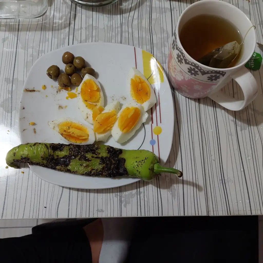 Sabah: 2 haşlama yumurta 1 koz biber 7 küçük kirik yeşil zeytin