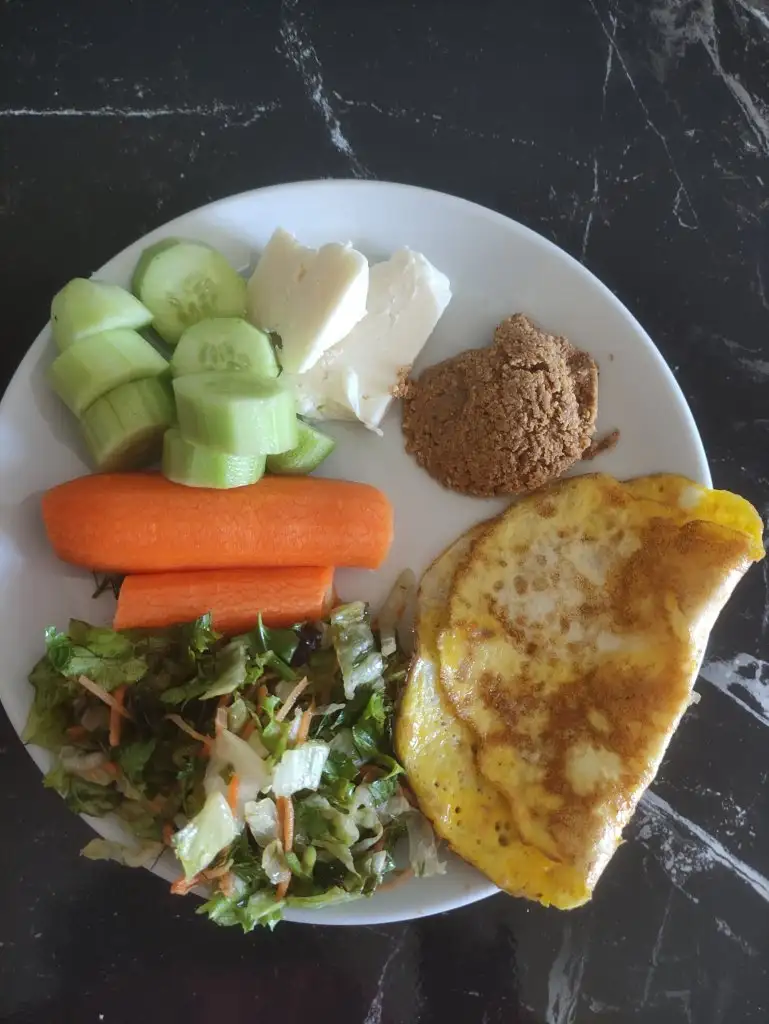 Omlet az peynir 7 zeytin salatalık 1 dilim karabugday ekmeği