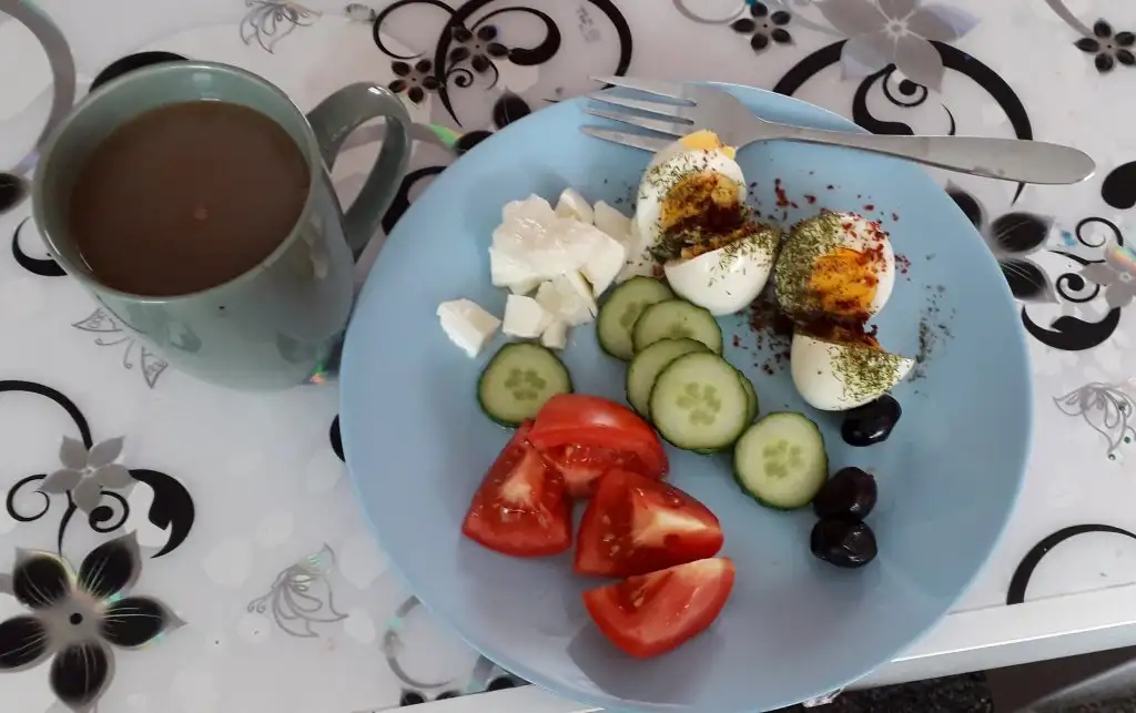 Kahvaltı = 1 haşlanmış yumurta 6 yeşilzeytin 1 çavdarlı etimek 1yk labne domates salatalık maydanoz 2 ceviz kayısı çayı