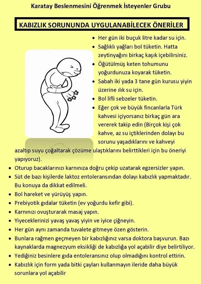 keten tohumu alsam napsamBu arada bunuda atayımda. Bende çok kabızlık sorunu çekiyorum zor şey şiş bir karınla dolaşmak. Benimde ameliyattan sonra değişti bağırsaklarım tembelleşti. Ben bunlar haricinde sütlü kahve içiyorum o da bana çok yarıyor.