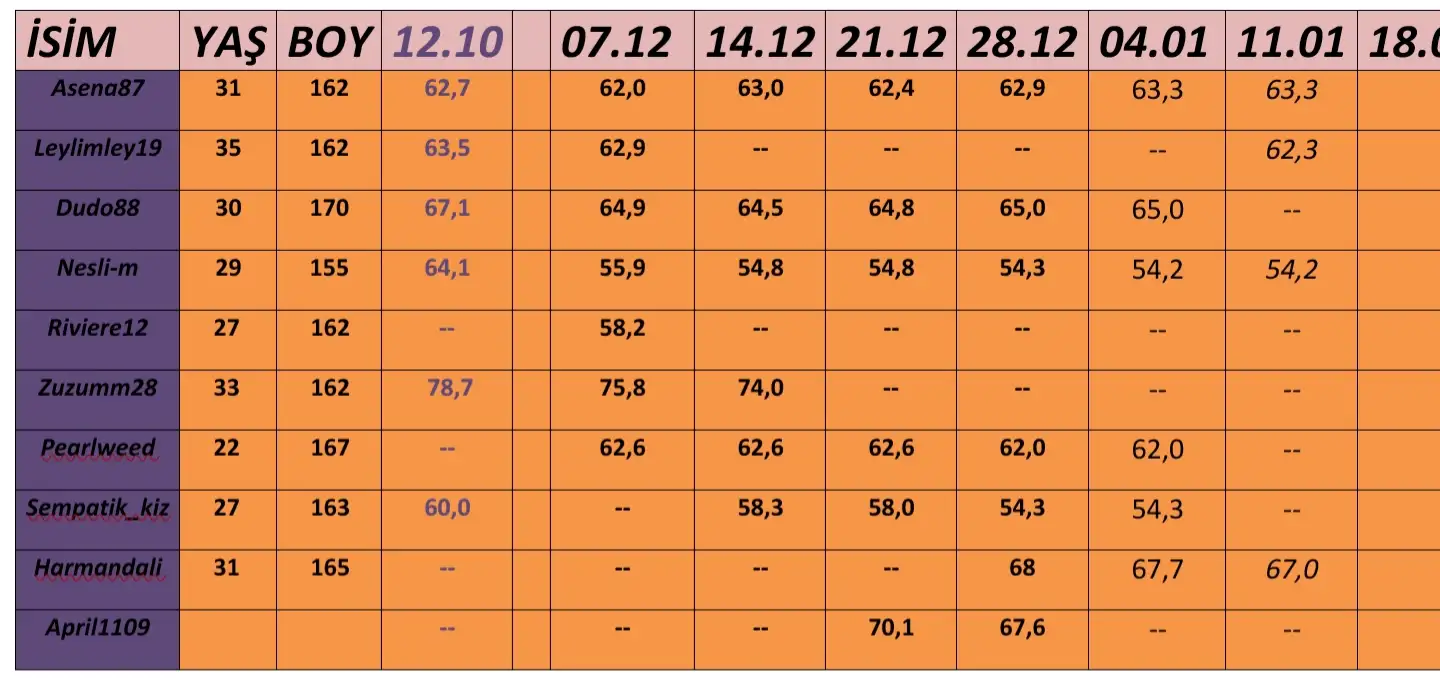 canım ben bilgileri vermemişim yaş 27 70.01 ile başladım şuan 67.9 im :) ağır bir hastalık atlattık antibiyotikler falan derken anca toparlandım ilaçlarım bitti şuan detoks uyguluyorum bi hafta da farkı göreceğim