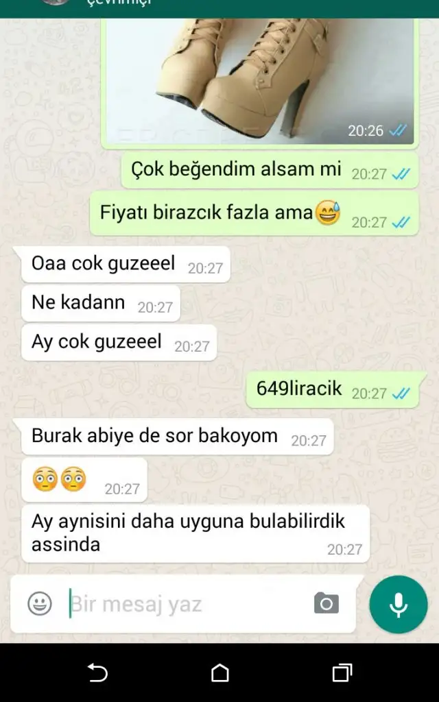 Ben: Ne yapıyorum aşkım şaka yaptım. Sen al desen bile ben bir ayakkabıya o parayı verir miyim sence?:)