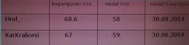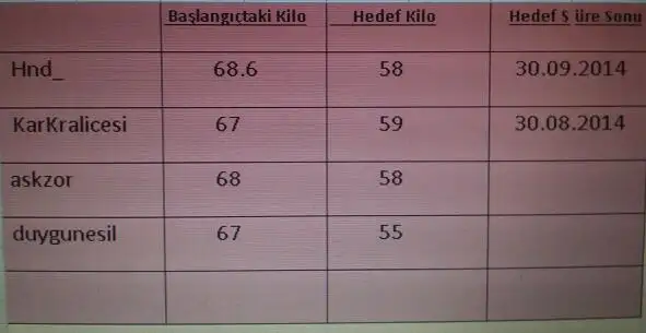 kızlar merhaba öncelikle hepinize. ben de sizinle beraber hedefime ulaşmak istıyorum beni de aranıza alır mısınız? boyum 1.69 kilom 67 benımde hedefim 55 kg olabilmek aslında ben geçen sene 15 kg verdim 79 kgdım ama bazı nedenlerden dolayı verdiğim 4 kgyi geri aldım ama pes etmek yok aldıklarımı ve daha fazlasını vererek hedefime ulaşmak istıyorum ne dersınız?Merhaba askzor. Elbette katıl ben de sevinirim Yaşın kaç boyun kaç hedef kilon kaç ? Bugün mü başlıyorsun diyete nasıl bir diyet uyguluyorsun