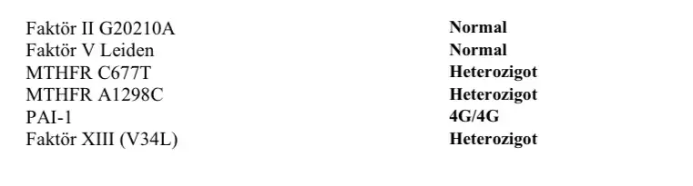 Merhaba canım oncelıkle cok gecmıs olsun Rabbım bır daha yasatmasın ınsallah.Sonucuna doktor baktıgında gerekenı yapar sen merak etme ama ben kendı sonucumla kıyasladıgımda sende pıhtılasmanın daha fazla oldugunu gordum gebelık kayıplarında kanın pıhtılasması bı neden olarak gorunuyor ve gebelıkte kan sulandırcı ıgne verıyor doktor bende sadece bı gende heterezıgot cıktıgı halde kan sulandırıcı ıgne ve coraspırın verdı hala kullanıyorum.Buyuk ıhtımal sanada bunlardan bahsedecektır doktorun.Sen Canını sıkma ama canım cunku bunlar çözümü olan şeyler yine ne gerekırse en ıyısını doktorun bılır ve sana bahseder işlemlerden.kızlar merhaba bir kimyasal bir de 11 haftalık düşük yaşadım sonuçlarıma şimdi baktım doktor randevusu alacağım hemen ama yaşayan bilen varsa yorum yapabilir misiniz