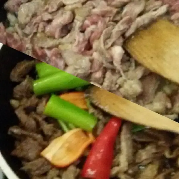Şimdi etimize gelelim. Etleri tuz ve karabiber ile baharatlayıp az bi yağla kavuyoruz.. zaten hemen suyunu bırakacak. . Suyunu çekince doğradığımız biberi ekleyip biraz daha kavuralım ve hazır..