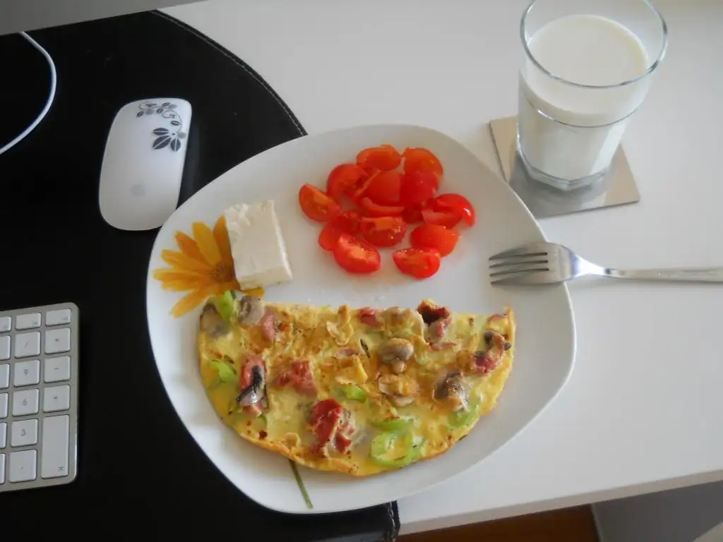 içinde 2ad. ince dilim salamı, 3 tane mantar, yarım yeşil biber, 2 ad. yumurtadan oluşan yağsız pişirilmiş omletimi, light peynir ve 4ad. çeri domates ile birlikte ve bir bardak ılık sütümü içtim..