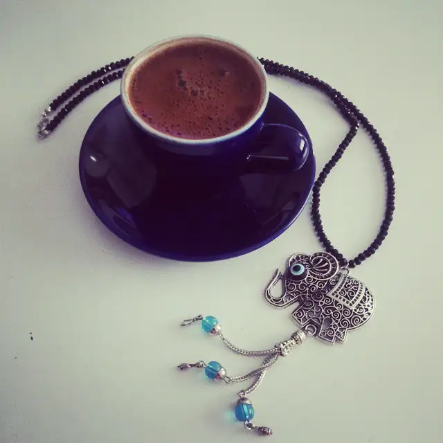 Kahve keyfimide yaptım hatta yanına yaptığım kolyelerden birini ekledim görüntü güzel olsun diye