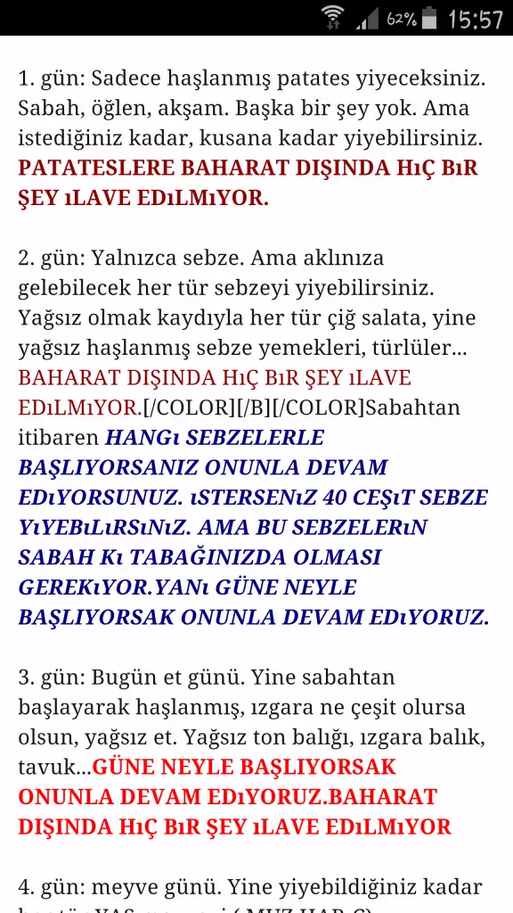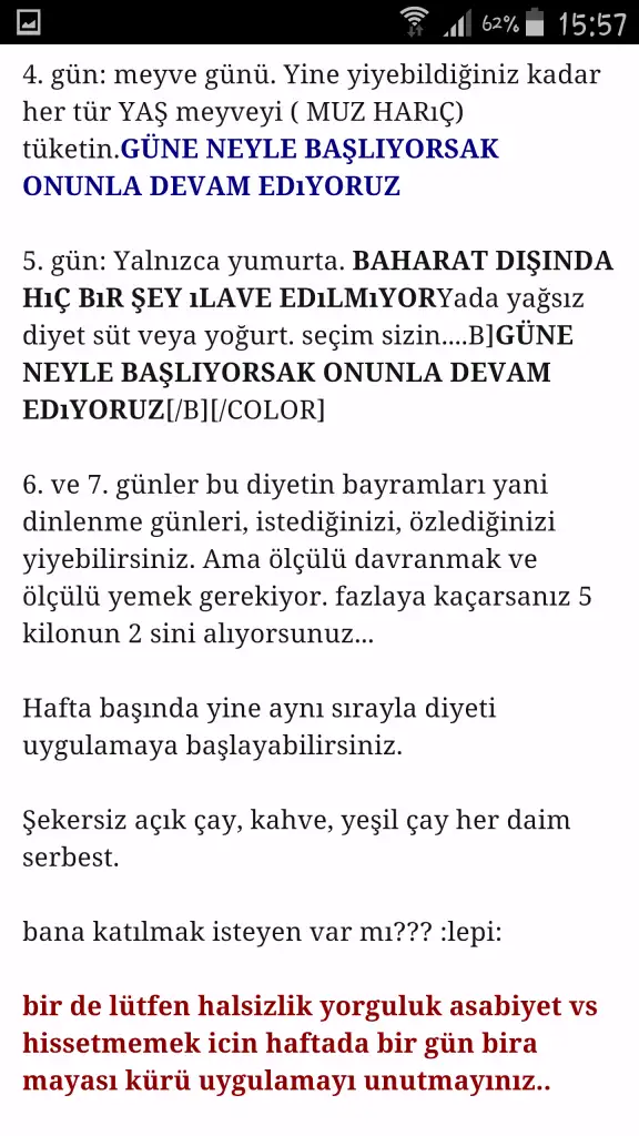 diyet bu canım ama tabi biz burda yazdığı gibi bütün gün aynı şeyi yemiyoruz mesela bugün sebze günüm benim sabah domates salatalık yedim arada havuç yedim öğle yemeğinde ve akşam yemeğinde bezelye yemeği yicem aksam acikirsam da salatalık havuç falan yerim bide bol su içiyorum yeşil çay limonlu sıcak su falan içiyorum sende bi dene canım eminim çok güzel sonuçlar alacaksın bide cuma günü kilo bildirimi yapıyoruz takım Kaptanımız sana kuralları yazar mutlaka