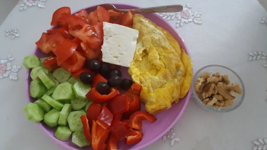 Öğle: Otlu omlet, börülce salatası, köz patlıcan biber salatası,yarım salkım siyah üzüm, 2 hünnap.