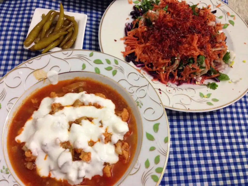 Aksam: kiymali karnibahar ve kabakli sebze yemegi, bol eksili salata, cin biber tursusuEki Görüntüle 1452948