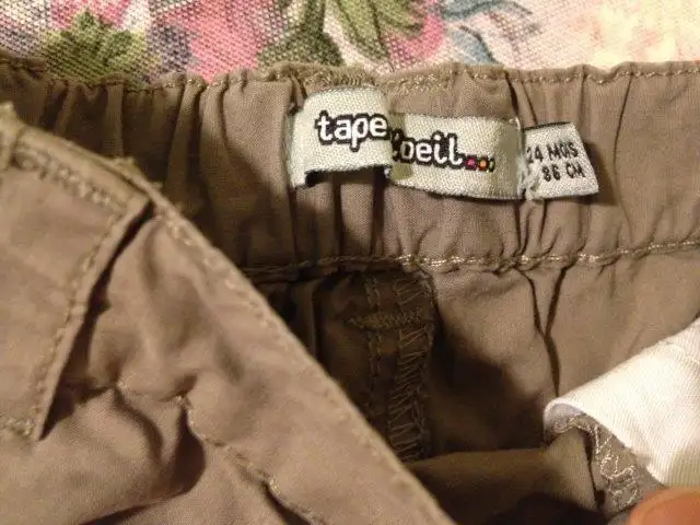 234- Tape à l'oeil 23 ay, 86 cm pantolon. %100 pamuk. Belden büzgülü, metal çıtçıt düğme. Fermuar yerine aralık var, büzgüsü güzel olduğundan rahat inip çıkar. Fiyat 15 tl..