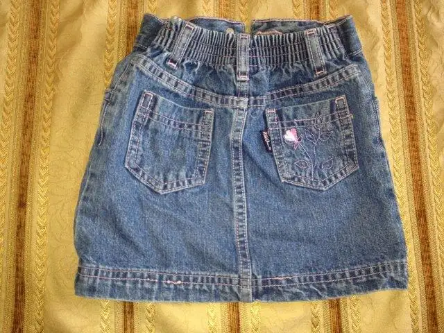 326- Negiş 4 yaş nakışlı kot etek. Bel arkası büzgülü, fermuarlı, metal düğmeli. Bel 22, gerildiğinde 27, boy 27 cm. 10 tl.