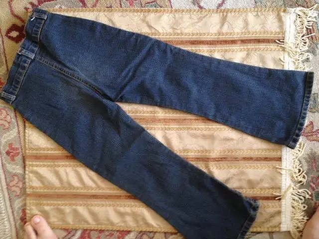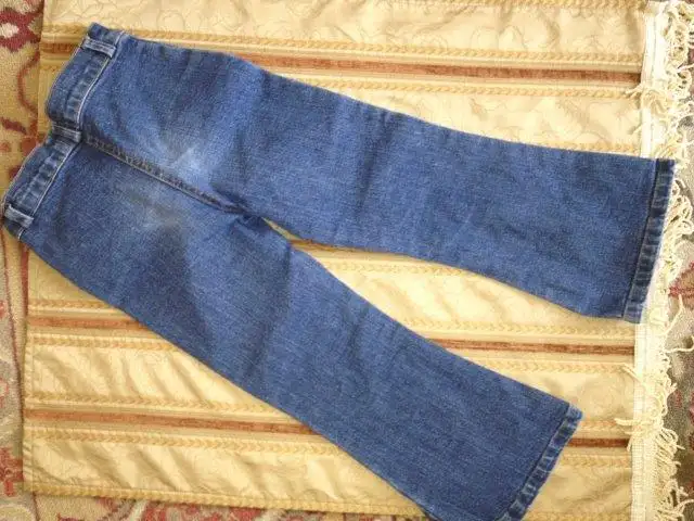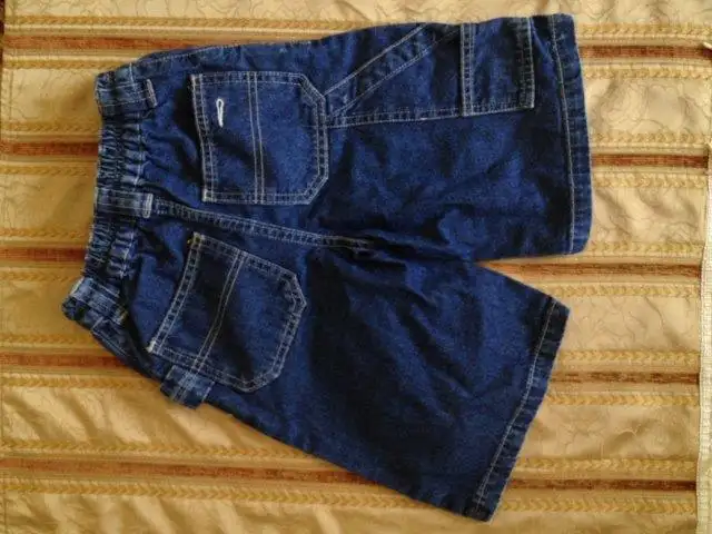 330- Kot pantolon. Beli lastikli, metal düğmeli, fermuarlı. 5 numara diyor, beli 25, gerildiğinde 29, boyu 72 cm. 4-5 yaşa göre. 10 tl.