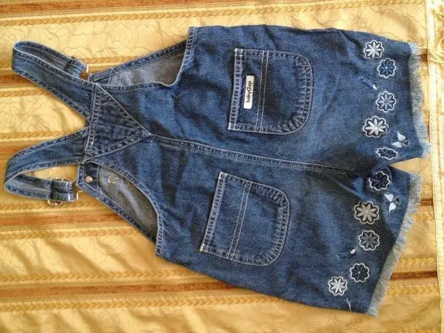 327- Paçaları nakışlı kot pantolon. Beli lastikli, fermuarlı, metal düğmeli. Etiket 3 numara diyor. 4-5 yaşa göre .Beli 26, gerildiğinde 29, boy 65 cm. 10 tl.