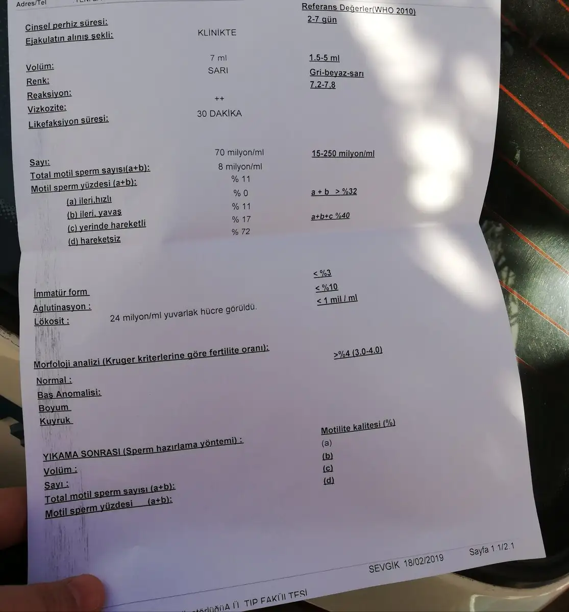 Canım doktor çok şükür normal dedi eşimin sonucu normal çıktı bendede bi anti tpo ve tsh yüksek çıktı onu düşürmek için doktora gidcm başka bi problemim yokmuş tsh düşünce kendiliğinden hamile kalırmışım hayırlısı olsun hakkımızda inşallah ❤Biz 3 yıldır uğraşıyoruz canım. şuan sarımsak nondoX ve klomen keçiboynuzu pekmezi , kaynatıp suyunu veriyorum arada bide çakşır kökü uyguluyorum eşime bakalım mayıs başı kontrole gidicez eğer o zamana kadar olmazsa bebek aşılama için eşimi ikna edicem