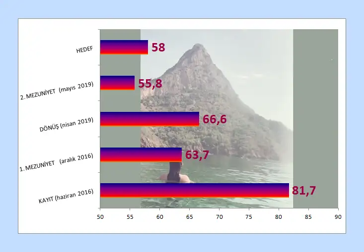 Altı ay gibi bir sürede 18 kilo vererek aynı yılın Aralık ayında mezun oldun. İlk mezuniyetinde hedefin 60 kilo idi ve sen 63,7 kilo ile mezun oldun.