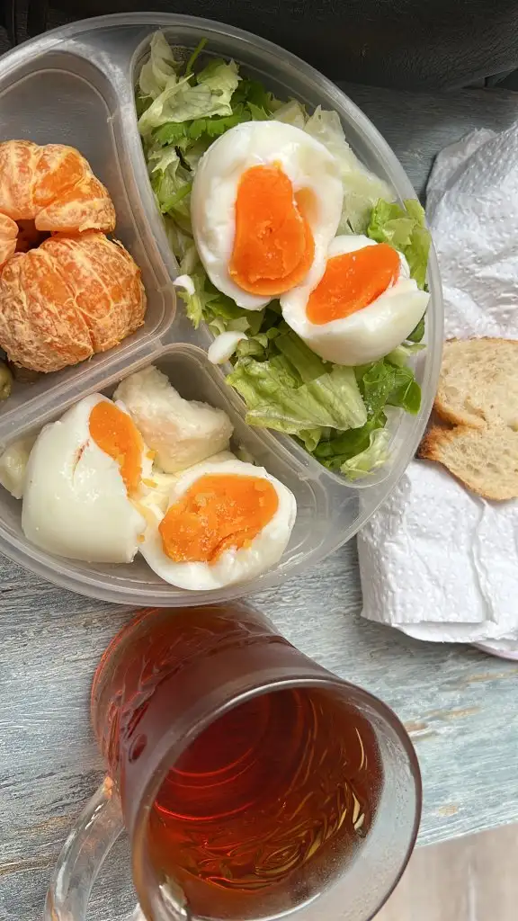 Kahvaltı: 1 haşlanmış yumurta, 6 zeytin, beyaz peynir, tam buğday ekmeği 1 dilim