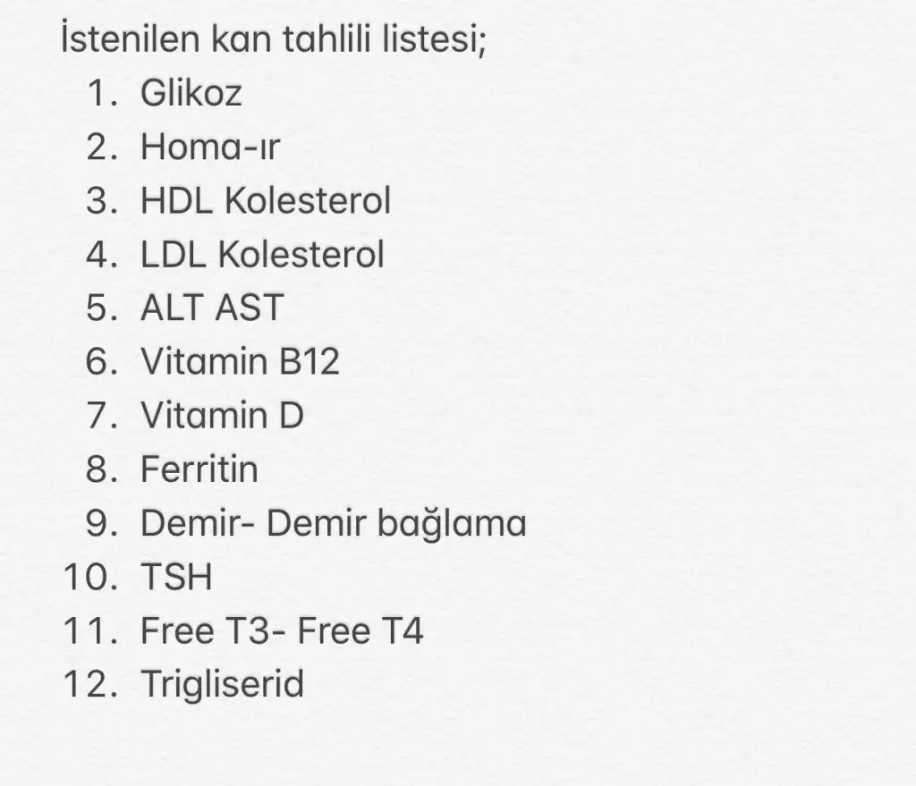 Ben yarin vericem diyetisyen bunları istedi bakEn son pandemi baslamisti ki martin basinda yaptirdim . Bir sorun yoktu . Belki hormonlara filan baktirmaliyim .dr a gitmek de istemiyorum. Bakayim iki hafta daha boyle olursa mutlaka kan vereyim haklisiniz sagolun.