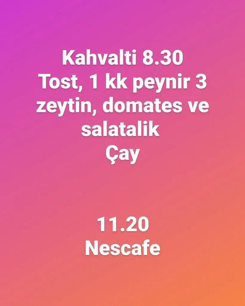 Sabah: 1 dilim uno denge ekmek,1 rafadan yumurta,peynir,zeytin,domates sos,biber sos,1 ceviz ,1 tatlı kaşığı bal,çaylar