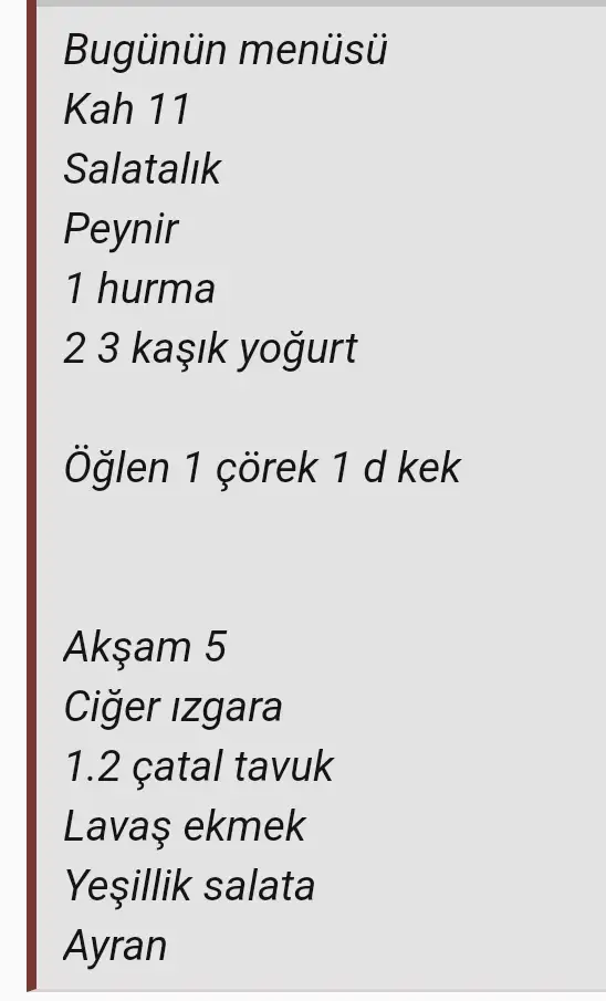 Sabah: 1 dilim uno denge ekmek,peynir,zeytin,lor,1 ceviz ,1 tatlı kaşığı kaymak,1 tatlı kaşığı bal,çaylar