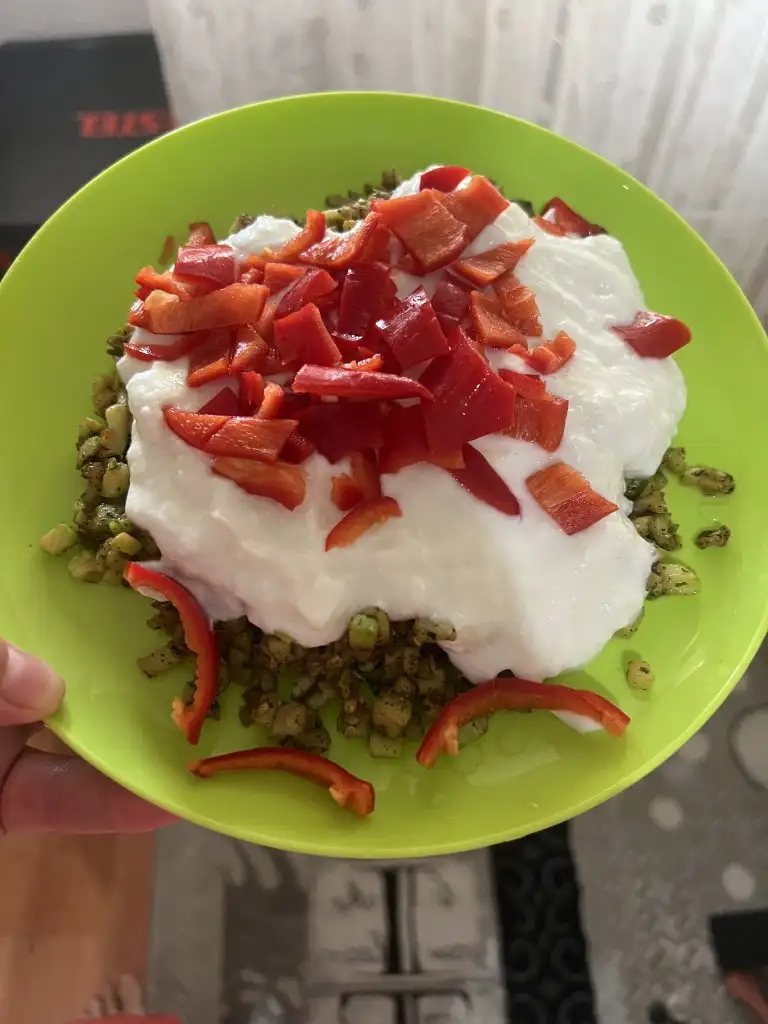 Canım afiyet olsun öğünlerin çok güzel fakat 743 kalori çok az bari 1000 e tamamla kilolar gittikçe kaloriyi azaltman gerekecek o zaman sıkıntı olur. Tabi bazal metabolizma hızın ölçüldüyse ve dr verdiyse birşey diyemem.Kızlar bu bebek 160 kalori. Küp doğranmış kavrulmuş kabak sarımsaklı yoğurt ve kapya biberi. 15:00 da şekersiz türk kahvesi ve 1 sade soda ara öğünümdü. Akşam 20:00 civarında bir yeşilçay içer günü kapatırım. Bugün abarttım sanki komple 743 kalori ile kapanacak gün inşallah