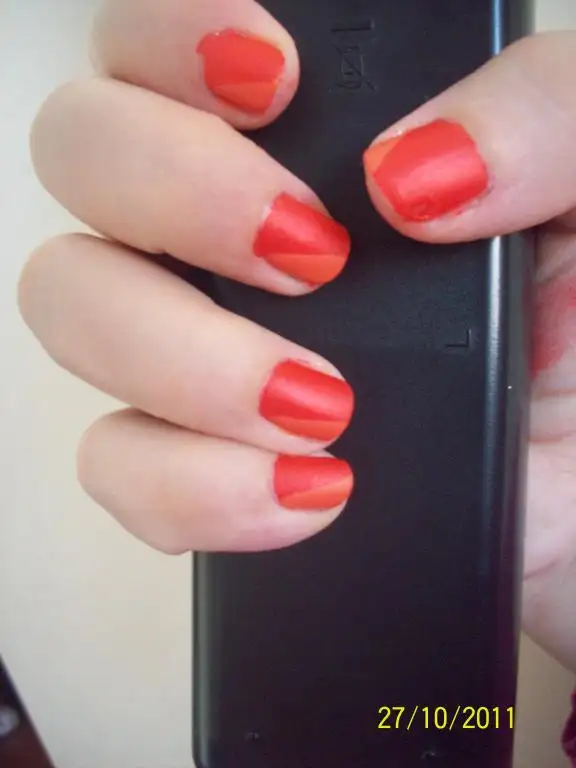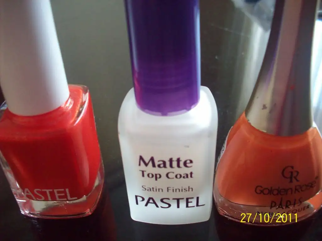bu kırmızı da çok hoş.. içinde pırıltılar var hafif turuncuya kaçıyor. ben de üzerine turuncu desen koydum elimden geldiğince. zıt renk yapmayı ama bu da fena olmadı. üzerinde de matlaştırıcı var.