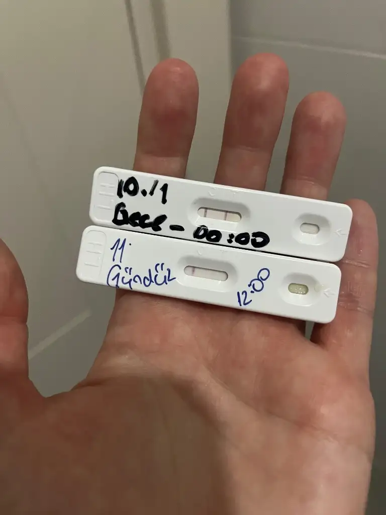 Merhaba. Düzensiz adet olurum. Bu ay takip ettim. Ve paylaştığım fotoğrafta test 9 da pik görmüştüm. 10. Gece(9.01.25) 00:00 yapılan test ve ertesi günü 11. Testte (10.01.25) çatlamayı görmüştüm. Ondan sonra testi bırakmıştım. Dün akşam kasık ağrı ve sızlama olunca 12. 01.25 22:30 testinde bu şekilde bulanık çizgi çıkmış. Testi yapıp silik görünce yatmıştım. Bu sabah gördüm. 13.01.25 tarihli testi bugün öğren 12:00 da yaptım çizgi görülmüyor ve kasık ağrımda öyle kalmadı.