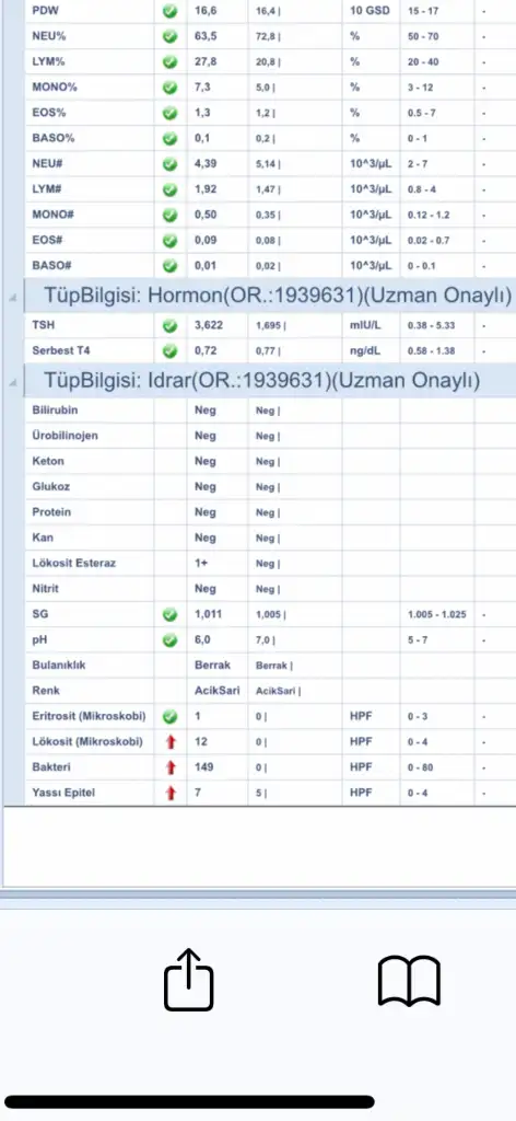 Aile hekimi yaptı zaten tahlili eğer acil durum varsa hemen kadın doğuma yollarım dedi sonuçlar çıkınca da aaaa seviyeler normal dedi hafif idrar da enfeksiyon var dedi bir gecelik ilaç verdi doktoruna mutlaka söyle kontrole gidince dedi kontrole de 2 gün var devlet Hastanesi'ne gidiyorum özele gitmiyorum maalesef