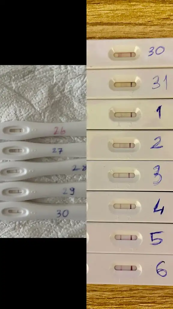 Benim de ilk baştaki yumurtlama pik günüm. Aradan 6 gün geçti en alttaki test et bugün yaptığım. Tam siliklesmişken tekrar baya koyu çıktı. Ama daha adetime 8 gün var. Sizce gebelik olduğunda böyle erken koyulaşmaya başlıyor mu?