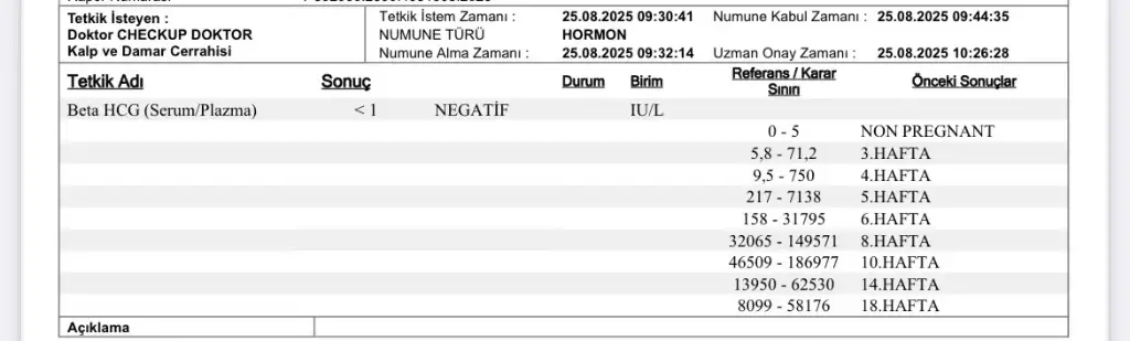 Yaklaşık 10 gün sonra geldi. Ayın 25 inde kan testi verdim. Sonuç < 1 olarak çıktı. Resmi de ekliyorum. Bu kan testinin de hatalı olma ihtimali yok değil mi? Geç döllenme vs.