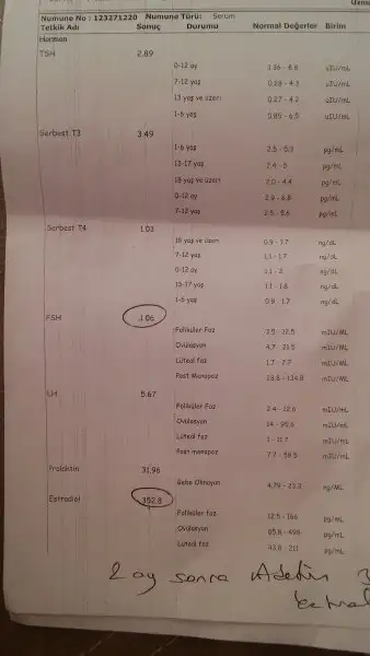 Cnm sen bu sonucu hemen başka doktora da göster. Ptolaktin biraz yüksek, süt hormonu yani gebeliğe engel olabilir. Ama bu estradiol kafamı karıştırdı benim ki 45 di normaldi. Ama yumurtlama döneminde yüksek olabilir belki.Sonuclar bu sekilde canim bi yoeumla istersen bilgin varsa..bi yoeum yaomadi 2 ay sonra gel dedi